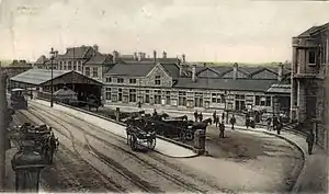 The South Devon Railway arrived at Plymouth in 1848 and a permanent station was established at Millbay the following year. This was on the western side of Plymouth Hoe and a new commercial dock was established on the shore opposite the station.[2] Immediately north of the station the railway crossed Union Street on a viaduct. This was a road which had been built to link the centres of the Three Towns.[1] The Cornwall Railway opened another line from Millbay through Devonport in 1859.[3]