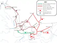 By 1930 it was becoming necessary to renew much of the tramway rolling stock. Consideration was given to converting to trolleybuses, but instead it was decided to implement a ten-year programme to replace the trams by motor buses. The first line to be converted was the Devonport to St Budeaux line which was closed in October 1930 when six new double-deck buses replaced the trams.[14] The line to West Hoe closed in 1931, the line to Compton closed in 1932, and regular services to the Royal Naval Barracks withdrawn in 1934. Further new buses were brought for these routes, and a few second hand tramcars from the now closed Exeter Tramway Company and Torquay Tramways allowed the oldest of the Plymouth cars to be withdrawn. In 1935 the Milehouse to Devonport line closed following the delivery of the city's first diesel-engined buses. More were needed in 1936 to allow the closure of the line to Prince Rock and in 1937 to allow the withdrawal of the two long circular routes.[15] The plan to replace the remaining trams was put on hold following the outbreak of World War II in September 1942 as they were powered by electricity generated by British coal, whereas buses relied on imported fuel. The one remaining route, from Theatre to Peverell, was therefore kept running. However, following city centre bomb damage in April 1941 (when car 133 was destroyed) the service only operated between Drake's Circus and Peverell. Milehouse depot was also bombed in April 1941. The final tram operated in September 1945 once the war in Europe was finished.[16]