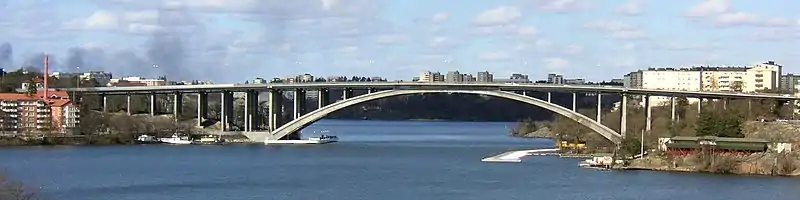 Tranebergsbron (The Traneberg Bridge) is a double arch bridge in central Stockholm, Sweden. Stretching over the strait Tranebergssund it connects the major island Kungsholmen to the western suburb Bromma. It carries a road and metro tracks.