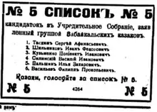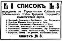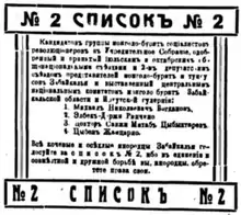 The Transbaikal electoral district (Russian: Забайкальский избирательный округ) was a constituency created for the 1917 Russian Constituent Assembly election. The electoral district covered the Transbaikal Oblast.[3] 6 out of the 15 submitted lists in Transbaikal were rejected by the electoral authorities.[4]