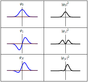 Three wavefunction solutions to the time-dependent Schrödinger equation for an electron in a harmonic oscillator potential. Left: The real part (blue) and imaginary part (red) of the wavefunction. Right: The probability of finding the particle at a certain position. The top row is an energy eigenstate with low energy, the middle row is an energy eigenstate with higher energy, and the bottom is a quantum superposition mixing those two states. The bottom-right shows that the electron is moving back and forth in the superposition state. This motion causes an oscillating electric dipole moment, which in turn is proportional to the transition dipole moment between the two eigenstates.