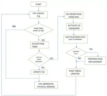 The flowchart provided explains the working of a TLB. If it is a TLB miss, then the CPU checks the page table for the page table entry. If the present bit is set, then the page is in main memory, and the processor can retrieve the frame number from the page-table entry to form the physical address.[7] The processor also updates the TLB to include the new page-table entry. Finally, if the present bit is not set, then the desired page is not in the main memory, and a page fault is issued. Then a page-fault interrupt is called, which executes the page-fault handling routine.