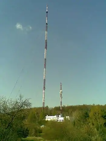 The antenna tower is a 267 metre tall guyed mast. It is located at the highest point of a beech forest in Szczecin, and transmits several stations. It was built in 1963. It has two antenna masts, which are 267 and 70 metres tall which are visible several kilometres away and hence a well-known local landmark. In the 1930s, an observation tower was put up. In 1963 a 228-metre mast for TV broadcasting was erected. It was raised a further 25 metres to carry antennas for directional radio services. In 1985 a new mast with a height of 267 m was built. The old mast was shortened in 1989 to 61 metres. (source: Polish text)