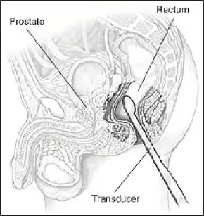 ![]() A probe inserted in the rectum emits sound waves in order to image the prostate | |