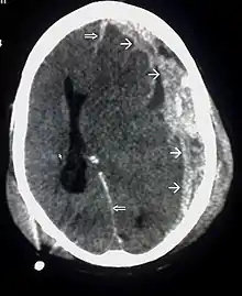 | CT scan showing cerebral contusions, hemorrhage within the hemispheres, subdural hematoma, and skull fractures[2] | |
