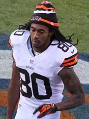 He started the Cleveland Browns' season-opener against the New York Jets and made three receptions for 89-yards and a touchdown as they lost 31–10.[44] The following week, he caught three passes for 115 receiving yards and two touchdowns receptions in a 28–14 victory over the Tennessee Titans.[45] Benjamin was responsible for three of the Browns' touchdowns during the game, catching a 60-yard and 50-yard touchdown pass from Johnny Manziel and returning a punt return for a 78-yard touchdown in the second quarter and was named the AFC Special Teams Player of the Week.[46][47] During a Week 3 matchup against the Oakland Raiders, Benjamin made four receptions for 45-yards and one touchdown in their 27–20 loss.[48] On October 18, 2015, Benjamin caught a season-high nine passes for a season-high 117 receiving yards as the Browns went on to lose 26–23 to the Denver Broncos.[49] In Week 10, he made seven catches for 113-yards and caught his fifth touchdown reception of the season in a 30–9 loss at the Pittsburgh Steelers.[50] Benjamin would finish the 2015 season with career-highs of 68 receptions for 966 receiving yards and five touchdown receptions in 15 starts and 16 games.[51] Unfortunately, the Cleveland Browns finished last in the AFC North for the fourth consecutive season with a 3–13 record and head coach Mike Pettine was fired after the season.[52]