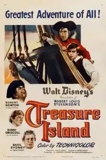 Treasure Island is a 1950 live action adventure film produced by Walt Disney Productions, adapted from Robert Louis Stevenson's 1883 novel. Directed by Byron Haskin, it stars Bobby Driscoll as Jim Hawkins and Robert Newton as Long John Silver. Treasure Island was Disney's first completely live-action film and the first screen version of Treasure Island made in color. It was filmed in England on location and at Denham Film Studios, Buckinghamshire.