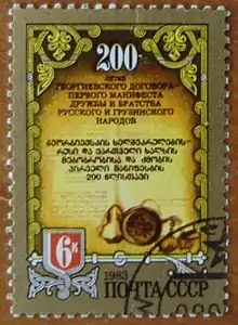 The Treaty of Georgievsk (Russian: Георгиевский трактат, Georgievskiy traktat; Georgian: გეორგიევსკის ტრაქტატი, georgievskis trakt'at'i) was a bilateral treaty concluded between the Russian Empire and the east Georgian kingdom of Kartli-Kakheti on July 24, 1783.[1] The treaty established eastern Georgia as a protectorate of Russia, which guaranteed its territorial integrity and the continuation of its reigning Bagrationi dynasty in return for prerogatives in the conduct of Georgian foreign affairs.[2] By this, eastern Georgia abjured any form of dependence on Persia (who had been its suzerain for centuries) or another power, and every new Georgian monarch of Kartli-Kakheti would require the confirmation and investiture of the Russian tsar.