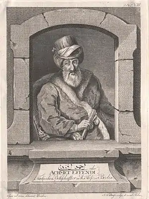 Ahmed Resmi Efendi (1700–1783) was an early example of this new generation. After classical scribal training Ahmed Resmi served as ambassador to Vienna (1757–1758) and Berlin (1763–1764). Additionally, he performed important administrative duties at the front during the disastrous Ottoman-Russian was of 1768–1774, and he was the chief Ottoman negotiator of the Kucuk-Kaynarca peace treaty. Thanks to this unique combination of experiences he witnessed the direct results of the empire's structural problems and was familiar with its military deficiencies.