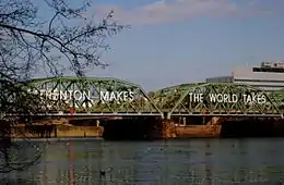 Several bridges across the Delaware River connect Trenton to Morrisville, Pennsylvania, all of which are operated by the Delaware River Joint Toll Bridge Commission.[47] The Trenton–Morrisville Toll Bridge, originally constructed in 1952, stretches 1,324 feet (404 m), carrying U.S. Route 1.[48] The Lower Trenton Bridge, bearing the legend "Trenton Makes The World Takes Bridge", is a 1,022-foot (312 m) span that was constructed in 1928 on the site of a bridge that dates back to 1804.[49] The Calhoun Street Bridge, dating back to 1884, is 1,274 feet (388 m) long.[50]