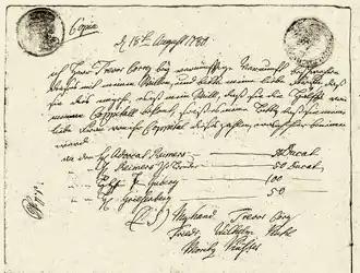 - Copy of a sworn statement by Friedrick Wilhelm Kuhl in German with English translation. 8 March 1781. The National Archives, Kew, Richmond, Surrey. Ref: PROB 18/93/90 C434350.