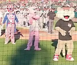 The ValleyCats have several mascots, the three most prominent being SouthPaw, his grandfather, Pappy, and his best friend, Ribbie. SouthPaw is a jersey-wearing cat, representing the "ValleyCat", the team's nickname. Another fan-favorite is Sammy Baseball who wears a patriotic costume and resembles Uncle Sam, reputedly derived from Samuel Wilson who operated a meat packing plant in Troy. The Tri-City Mayors, large caricature heads representing the current Mayors of Troy, Albany, and Schenectady, race (and dance) on a nightly basis at the ballpark. Ketchup, Mustard, and Relish mascots participate in a hot dog race. Other mascots include Spiedie the Chicken, Zoggy the Dinosaur, and Rowdy the River Rat, obtained when the Albany River Rats moved to Charlotte, North Carolina.[10]