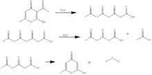 Triacetic acid lactone is synthesized either from dehydroacetic acid, another 2-pyrone derivative, or from glucose by enzymatic catalysis. In its original synthesis, triacetic acid lactone was obtained by treatment of dehydroacetic acid with sulfuric acid at 135 °C. Dehydroacetic acid undergoes ring-opening and hydration to form "tetracetic acid".[2] Upon cooling, triacetic acid reverts to a lactone ring similar to the dehydroacetic acid structure, and the triacetic acid lactone is recovered by crystallization in cold water.