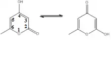 The tautomer on the left, featuring a 4-hydroxy group, the C4 carbon, is dominant. Triacetic acid lactone is classified as a 2-pyrone compound owing to the ketone group on the C2 carbon in its dominant form.