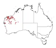 It is found in the IBRA Regions of the Central Kimberley, the Gascoyne, the Little Sandy Desert, the Murchison, and the Pilbara,[4] in rocky areas, including creek banks and beds, and often in sand.[5]