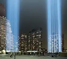 The Tribute in Light is an art installation created in remembrance of the September 11 attacks.[1] It consists of 88 vertical searchlights arranged in two columns of light to represent the Twin Towers. It stands six blocks south of the World Trade Center on top of the Battery Parking Garage[2] in New York City. Tribute in Light began as a temporary commemoration of the attacks in early 2002, but it became an annual event, currently produced on September 11 by the Municipal Art Society of New York.[3][4][5] The Tribute in Light was conceived by artists John Bennett, Gustavo Bonevardi, Richard Nash Gould, Julian LaVerdiere, and Paul Myoda, and lighting consultant Paul Marantz.[6]