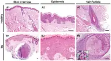 TS was first described in a 1995 case report as "ciclosporin-induced folliculodystrophy", thought at the time to be an adverse effect of ciclosporin treatment.[3][13] A subsequent report in 1999, which introduced the term "trichodysplasia spinulosa", used electron microscopy to identify the presence of virus particles in affected cells consistent with what were at the time known as papovaviruses.[14] (The group has since been divided into the papillomavirus and polyomavirus families.) In 2010, researchers used rolling circle amplification to recover viral DNA from TS lesions and thus discovered a novel polyomavirus, trichodysplasia spinulosa polyomavirus (TSPyV). There is compelling evidence that TSPyV is the direct causative agent of TS.[2][3]