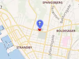 In the late 1950s, Erik Flagstad Rasmussen and Knud Thomsen won the competition which had been specifically directed to attract responses from the city's architects. The church itself is a square-shaped building of yellow brick crowned with a low octagonal spire. There are four triangular gables of glass and concrete, all with pointed tops. Completed in 1967, the stained-glass gable windows were designed by Jens Urup Jensen with themes representing Christmas (north) with a red Star of Bethlehem, Easter (east, above the altar) with a cross, Whitsun (south) with 12 red tongues symbolising the Apostles and a blue-toned Water of Life frame (west) above the organ gallery. The colouring of the north and south windows is rather cool while the designs to the east and west are much warmer.[2][3]