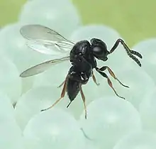 Trissolcus japonicus or the samurai wasp is a parasitoid wasp species in the family Scelionidae, native to east Asia but now found in Europe, North America, and Chile.[2][3] It is chiefly known for parasitizing Halyomorpha halys (brown marmorated stink bug).[4] It deposits eggs into the eggs of the stink bug, and as the wasp larvae develop, they kill the stink bug eggs. A single adult wasp emerges from each stink bug egg.[5]