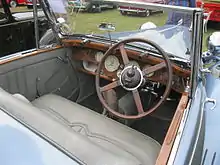 Triumph had been moving progressively upmarket during the 1930s, and the 1938 Dolomites were very well equipped, with winding windows in the doors, automatic chassis lubrication, a leather-bound steering wheel adjustable for rake and reach, dual hydraulic brake circuits, twin trumpet horns, and spot lamps included in the price.[10] There was even a tray of fitted tools slotted beneath the driver's seat cushion, and for an extra 18 guineas buyers could specify a radio.[10]