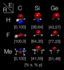 The percent of spin occupation in the valence s orbital can be used to directly probe the structure of these molecules. If the spin occupation 100% in a p orbital, then the molecule will have a Type C planar structure. However, if there is 25% s orbital and 75% p orbital occupation, then the molecule will have a pyramidal Type A structure. Any intermediate value is possible and would correspond to a Type B structure. Values of greater than 25% s orbital contribution can also be found upon coordination of a tetrel to electronegative ligands (-OR, -F, -NR2, -Cl).[13]