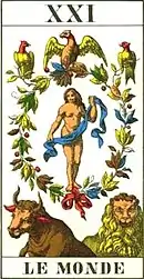 Troccas decks are sometimes called "1JJ" or "Jupiter and Juno" decks because they substitute Jupiter and Juno for the Pope and Papess of the Tarot of Marseilles.[1] The deck's captions are usually in French or German, but a version with English captions has been published.