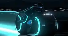 Light cycles were originally fictional vehicles designed by Syd Mead for the simulated world of the Tron universe. 5 real-life replica light cycles were created by Parker Brothers Concepts in Florida, one of which was sold by Sotheby's for a reported $77,000.[87][88]