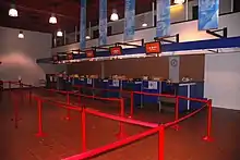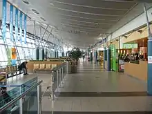The civilian sector consists of two terminals—A and B—which combined are 20,000 square metres (220,000 sq ft), of which 13,500 square metres (145,000 sq ft) is passenger facilities. Terminal A is used for domestic traffic, while Terminal B is used for international services. The check-in facilities for domestic, international and charter are all fitted together at second floor at terminal A. The terminal contains an array of stores and dining places; these include a book store, convenience stores; clothing, crafts and cosmetics; diners, restaurants and pubs; and a 560 square metres (6,000 sq ft) duty-free store. The airport also has three automatic teller machines and a Radisson Blu hotel with 180 rooms and 11 conference rooms. Scandic Hell operates another hotel, the 400-room Rica Hell Hotel, within walking distance of the airport.[10] The airport administration is located in Terminal B, while the administration for airlines and handling agents is located in annexes of Terminal A.[11]
