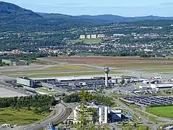 Trondheim Airport is a joint military and civilian airport located in the municipality of Stjørdal in Trøndelag, with the northern part of the airport bordering the town of Stjørdalshalsen.[7] To the west, the airport borders the Trondheimsfjord, and to the south the Stjørdal River.[8] Combining the functions as an international, domestic and regional airport, it is located 10 nautical miles (19 km; 12 mi) east of Trondheim.[1] Most of the airport area is owned by the Norwegian Ministry of Defence, although the civilian facilities and the air traffic control are owned and operated by Avinor, a subsidiary of the Norwegian Ministry of Transport and Communications.[9]