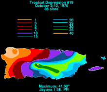 Tropical Depression Fifteen in 1970 was the wettest known tropical cyclone to affect the United States territory of Puerto Rico.[1] The long-lived depression formed on September 24 just off the west coast of Africa, and for several days maintained a general westward track. It passed through the Lesser Antilles on October 1, and later stalled in the eastern Caribbean Sea. On October 8, the depression crossed over the Dominican Republic, and subsequently it accelerated to the northeast. It was declassified as a tropical cyclone on October 12, although its remnants persisted for another week before dissipating in the westerlies near the Azores.