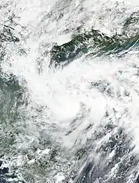 Later, the low-pressure area moved southwestward on October 12,[19] until the well-marked low pressure area of Aere re-generated into a tropical depression early on October 13.[20][21] The JMA started to tracked the tropical depression[22] and the JTWC re-issued advisories too.[23] Now moving westward, Aere had flaring convection with weak banding and was located in an area of high SSTs and low wind shear.[24] Although the system had failed to re-organize into a weak tropical storm, the JTWC issued its final advisory and shortly thereafter it made landfall several kilometers north of Da Nang, Vietnam.[25] The remnants of Aere was tracked by the JMA as a weak tropical depression on October 14.[26] It moved towards Laos and Thailand[27] until it fully dissipated later that day.[26]