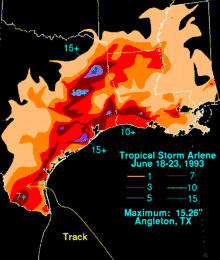 Tropical Storm Arlene brought torrential rainfall to the western United States Gulf Coast, particularly to the U.S. state of Texas, in June 1993. The first named storm of the 1993 Atlantic hurricane season, Arlene developed from an area of low pressure in the Bay of Campeche on June 18. The depression slowly strengthened as it tracked west-northwestward and later north-northwestward across the western Gulf of Mexico. Arlene was subsequently upgraded to a tropical storm on June 19, but failed to intensify further due to its proximity to land. The cyclone then made landfall on Padre Island, Texas, with winds of 40 mph (65 km/h) and degenerated into a remnant disturbance on June 21.