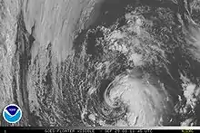 During the afternoon, satellites revealed that Laura had developed a deep warm core, a characteristic of a tropical cyclone, but the wind field remained subtropical in nature.[5] By the nighttime hours, the radius of the strongest winds contracted to 80 mi (130 km), much smaller than what is typical of a subtropical cyclone. However, Laura was still under the influence of an upper-level low and cloud tops remained shallow.[6] However, the cloud tops became colder overnight and Laura was on the verge of becoming a tropical cyclone by the morning of September 30, but strong interaction with the upper-level low meant it was still subtropical.[7] Despite moving over colder waters, a water vapor satellite image determined that Laura had separated itself from the upper-level low, signifying it had developed into a tropical cyclone. Laura was re-classified as a tropical storm at a relatively high latitude,[8] 40.6°N.[1] Not long after being declared tropical, early signs of an extratropical transition appeared. Cold air began to enter the storm on the west side and forecast models showed Laura becoming extratropical the next morning and non-tropical later the next day.[9]