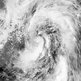 A large system, roughly 1,480 km (920 mi) wide, convection was slow to consolidate over the center which remained mostly cloud free. Microwave satellite imagery indicated that the system lacked strong inflow, leading to a disorganized structure. Due to its large size, slow intensification was expected over the following several days as the storm tracked generally northwestward towards Taiwan.[6] Early on June 22, the depression intensified into a tropical storm, at which time the JMA assigned it the name Meari.[3] Around the time it was upgraded, the storm had grown to a size that covered nearly the entire Philippine Sea.[7] By June 23, convection began consolidating near the storm's center, indicating that the storm was intensifying.[8] The following day, the JMA estimated that Meari strengthened to a severe tropical storm, with maximum sustained winds around 95 km/h (60 mph).[3] Later that day, the storm's expansive windfield began to contract as an upper-level trough near Taiwan impinged on the western edge of Meari. Though the storm's overall structure degraded somewhat, surface observations continued to show intensification with a meteorological station on Shimojishima reporting winds of 124 km/h (77 mph).[9]