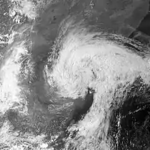 Late on June 24, Tropical Storm Meari is estimated to have attained its peak intensity with winds around 110 km/h (70 mph) and a barometric pressure of 975 mbar (hPa; 28.79 inHg).[3] Situated northeast of Taiwan, the storm turned northward due to a blocking ridge over Manchuria, China.[10] By this time, the storm moved out of PAGASA's area of responsibility and the agency issued their final advisory.[11] Throughout June 25, Meari's structure rapidly degraded as an approaching trough produced major subsidence over the northwester portion of the storm.[12] Situated between a subtropical ridge to the east and a trough to the west, the storm rapidly accelerated northward towards the Korean Peninsula. During this time, the system crossed over significantly cooler waters and alongside the subsidence, convection struggled to develop.[13] Once over the East China Sea on June 26, the vertical structure of Meari significantly degraded, leaving only a surface low. In light of this, the storm turned back towards the northwest, again threatening China.[14] Void of convection due to shear from the mid-latitude Westerlies, the weakened system soon made landfall along the Shandong Peninsula.[15] After remaining near the peninsula for several hours, Meari rapidly accelerated towards the northeast and began taking on characteristics of an extratropical cyclone.[16] Early on June 27, the storm completed the transition into an extratropical system hours before striking North Korea near the city of Anju with winds of 85 km/h (50 mph). Hours after moving onshore, the storm rapidly dissipated and was last noted around 1200 UTC.[3]