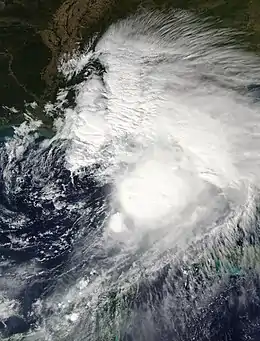 Nestor began to then accelerate to the northeast aided by a ridge to its northeast, although wind shear generated by a nearby trough almost embedded within the northern side of the cyclone began to give Nestor a lopsided appearance on satellite imagery shortly after its designation.[8][9] Due to Nestor's broad nature, gale-force winds were already beginning to be observed near the coast of Florida Panhandle.[10] The system began to slow down as wind shear generated by the trough caused the storm to weaken as it neared the Florida Panhandle coast. Nestor rapidly lost its tropical characteristics due to interaction with this trough, and was declared to have become an extratropical cyclone early on October 19, however still bringing storm surge and heavy rains to the coast anyway.[11] Nestor's post-tropical remnant then made landfall in St. Vincent Island, Florida with winds up to 45 mph,[12] becoming further disorganized across the Southeastern United States for the next couple of days. On October 21, Nestor's extratropical remnant was absorbed into another extratropical storm off the coast of the Southeastern United States.