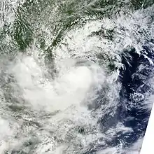 As the storm neared land, a Vietnamese boat carrying 12 fishermen capsized and drifted towards Palawan, near the Philippines. A few hours later, the fishermen were rescued.[44] The Thai Meteorological Department issued warnings for Phuket and much of Thailand. Strong winds and heavy rain were predicted to affect the Andaman Sea.[45] As a result, the people of Thailand's northern provinces started preparing for floods and strong winds. The Yom River and the Nan River were reported to be almost overflowing, damaging rice paddy fields and farmland.[46] About 650,000 people were evacuated from low-lying areas in the Tonkin Gulf region.[47] On July 30, just before final landfall, the storm started claiming Vietnamese, with one man killed by the waves. As a result, meteorological officials repeated their warning that small boats should not put to sea.[48] Later that day, some 6 flights of Vietnam Airlines were cancelled and many more were delayed because of the storm.[49] Over the next day, after the storm's final landfall, some 6,200 acres of rice and other crop fields were reported to be completely submerged.[50] The storm's consequences were described as "not considerable" as the storm did not cause much damage.[51]