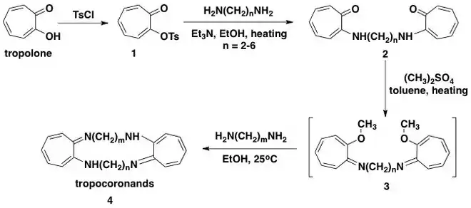 Either 2-tosyloxytropone (1)[5][6] or 2-chlorotropone can be made from tropolone and then reacted with the appropriate diamine to give diaminodiketones 2. These diketones then give dialkoxydiimines 3 by treatment with dimethyl sulfate in refluxing toluene, or with triethyloxonium tetrafluoroborate in refluxing chloroform/hexamethylphosphoramide. The resulting dialkoxides can then undergo amine displacement and ring closure at 25 °C to form tropocoronands 4. Reported yields in the cyclization are generally in the range of 20 – 40%, but only 2% when m = n = 2. In most of the cases decreasing the straight-chain linkages size results in lower yields however Nozoe has demonstrated yields of 55– 65% for m = n = 3 using methylfluorosulfate in dichloromethane as the alkylating agent.[7]