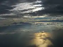 The troposphere is the lowest layer of Earth's atmosphere, and is also where nearly all weather conditions take place. It contains 75% of the atmosphere's mass and 99% of the total mass of water vapour and aerosols.[2] The average height of the troposphere is 18 km (11 mi; 59,000 ft) in the tropics, 17 km (11 mi; 56,000 ft) in the middle latitudes, and 6 km (3.7 mi; 20,000 ft) in the polar regions in winter. The total average height of the troposphere is 13 km (8.1 mi; 43,000 ft).