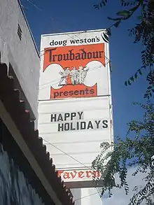 The Troubadour is a nightclub located in West Hollywood, California, United States, at 9081 Santa Monica Boulevard just east of Doheny Drive and the border of Beverly Hills. Inspired by a visit to the then newly opened Troubadour café in London, it was opened in 1957 by Doug Weston as a coffee house on La Cienega Boulevard, then moved to its current location shortly after opening and has remained open continuously since.[1][2] It was a major center for folk music in the 1960s, and subsequently for singer-songwriters and rock. In 2011, a documentary about the club called Troubadours: Carole King / James Taylor & The Rise of the Singer-Songwriter was released.[3][4]