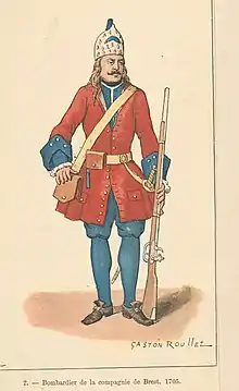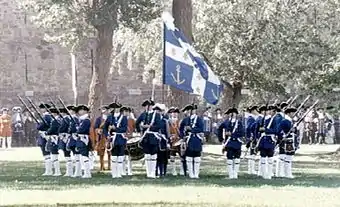 The Troupes de la Marine (Troops of the French Navy), was a military body founded by Cardinal Richelieu in 1622 under the denomination of Compagnies Ordinaires de la Mer, were originally intended to form the garrisons of the ships of the King. It was in 1674 that Jean-Baptiste Colbert decides to make permanent colonial troops and give them the name of Compagnies Franches de la Marine.[1]