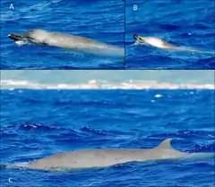 This whale has a normal mesoplodont body, except that it is rotund in the middle and tapering towards the ends. The two distinctive teeth on the males are small and set on the very end of the beak (however additional teeth have been recorded [3]). The melon is rather bulbous, and leads into a short beak. There is a crease behind the blowhole, and a sharp dorsal ridge on the back near the dorsal fin. The coloration is gray to brownish gray on the back which is lighter below, and notably darker on the "lips", around the eye, and near the dorsal fin. There is sometimes a dark blaze between the head and dorsal fin as well. One female in the Southern Hemisphere was bluish black with a white area between the dorsal fin and tail as well as a light gray jaw and throat, as well as black speckling. One individual from the Canary Islands had an area of white from snout to blowhole.[4] Scars from fighting and cookiecutter sharks are present on males. This species reaches around 5.3 metres (17 ft) with the females weighing 1,400 kilograms (3,100 lb) and the males weighing 1,010 kilograms (2,230 lb). They are around 2.2 metres (7.2 ft) long when born.