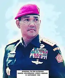 Try Sutrisno (Indonesian pronunciation: [tri sutrisnɔ]; born 15 November 1935) is an Indonesian politician and retired army general who served as the country's sixth vice president. He held the office from 11 March 1993 to 11 March 1998. Previously, he served as the Commander of the Republic of Indonesia Armed Forces for five years.