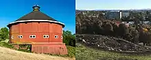 The fire devastated the Coffey Park neighborhood,[26][27] where an estimated 1,300 structures, mostly detached homes, were leveled.[28] Meanwhile, east of the highway, the Fountaingrove Inn, the historic Fountaingrove Round Barn nearby, and a large Hilton hotel were destroyed;[29][30] 116 of the 160 units at the Journey's End Mobile Home Park burned to the ground, while the remainder of the park was later red-tagged due to heavy damage.[31] Other damage along several streets bordering Highway 101 included a Kmart store and numerous restaurants that burned to the ground.[32][33]