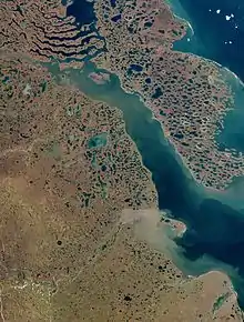 Tuktoyaktuk English: /tʌktəˈjæktʌk/, or Tuktuyaaqtuuq IPA: [təktujaːqtuːq] (Inuvialuktun: it looks like a caribou),[4] is an Inuvialuit hamlet located in the Inuvik Region of the Northwest Territories, Canada, at the northern terminus of the Inuvik–Tuktoyaktuk Highway.[8][9] Tuktoyaktuk, often called Tuk is one of six Inuvialuit communities in the Inuvialuit Settlement Region. Tuktoyaktuk is commonly referred to simply by its first syllable, Tuk /tʌk/.[10] The settlement lies north of the Arctic Circle on the shores of the Arctic Ocean, and is the only community in Canada on the Arctic Ocean that is connected to the rest of Canada by road.[8] Formerly known as Port Brabant, the community was renamed in 1950 and was the first place in Canada to revert to the traditional Indigenous name.[11]