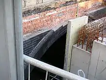 - Victoria Street Tunnel (south portal: 52.9513°N 1.1461°W, north portal: 52.955548°N 1.147063°W) also known as Weekday Cross Tunnel currently accommodates steam heating pipes from Nottingham's Cattle Market waste incinerator for the Victoria flats above Victoria Shopping Centre. This tunnel is 19 chains long (418 yards) and was originally built for the Great Central Railway completed in 1897 although the Great Central's Nottingham Victoria Station was not completed until 1900. The Victoria Shopping Centre was built on the site of the demolished Victoria Station. This tunnel runs south from Victoria Shopping Centre to its south portal near to Nottingham's Galleries of Justice at Weekday Cross. The Nottingham Express Transit line proceeds from just south of this portal towards Midland Railway Station on an original GCR viaduct. The Centre for Contemporary Art Nottingham (CCAN) has recently been built in the railway cutting in which the south portal resides.