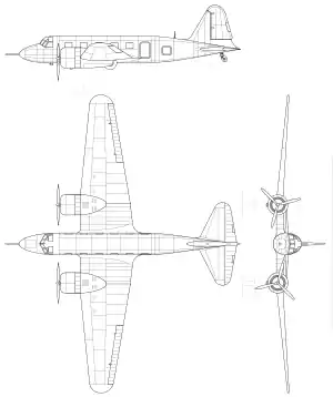 The ANT-35's cabin, with a headroom of only 1.68 m (5 ft 6 in), and further constricted by having the wing spars pass through it, was very cramped, and the second prototype, designated the ANT-35bis, had the fuselage height increased by 0.15 m (5.9 in), greatly improving space for the passengers, while two 750 kW (1,000 hp) Wright Cyclone G2 engines were fitted.[3][6] The ANT-35bis was completed in June 1937, and the type was put into production at Factory No 22 in Moscow, with production aircraft powered by Cyclones or the Soviet licence-built derivtive, the Shvetsov M-62IR, with deliveries starting in 1938. By 1939, Soviet factories had begun license-building the Douglas DC-3 airliner, which used the same engines but could carry twice the passengers over a greater range and production of the ANT-35bis was stopped in 1939, with only nine aircraft (plus the two prototypes), completed.[7][4]