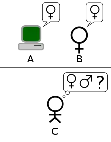The Turing test, originally called the imitation game by Alan Turing in 1950,[2] is a test of a machine's ability to exhibit intelligent behaviour equivalent to, or indistinguishable from, that of a human. Turing proposed that a human evaluator would judge natural language conversations between a human and a machine designed to generate human-like responses. The evaluator would be aware that one of the two partners in conversation is a machine, and all participants would be separated from one another. The conversation would be limited to a text-only channel such as a computer keyboard and screen so the result would not depend on the machine's ability to render words as speech.[3] If the evaluator cannot reliably tell the machine from the human, the machine is said to have passed the test. The test results do not depend on the machine's ability to give correct answers to questions, only how closely its answers resemble those a human would give.