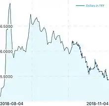 The Turkish currency and debt crisis of 2018 (Turkish: Türk döviz ve borç krizi) is a financial and economic crisis in Turkey. It was characterized by the Turkish lira (TRY) plunging in value, high inflation, rising borrowing costs, and correspondingly rising loan defaults. The crisis was caused by the Turkish economy's excessive current account deficit and large amounts of private foreign-currency denominated debt, in combination with President Recep Tayyip Erdoğan's increasing authoritarianism and his unorthodox ideas about interest rate policy.[1][2][3][4] Some analysts also stress the leveraging effects of the geopolitical frictions with the United States and recently enforced tariffs by the Trump administration on some Turkish products such as steel and aluminum.[5]
