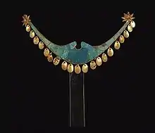 The Ancient Egyptian use of turquoise stretches back as far as the First Dynasty and possibly earlier; however, probably the most well-known pieces incorporating the gem are those recovered from Tutankhamun's tomb, most notably the Pharaoh's iconic burial mask which was liberally inlaid with the stone. It also adorned rings and great sweeping necklaces called pectorals. Set in gold, the gem was fashioned into beads, used as inlay, and often carved in a scarab motif, accompanied by carnelian, lapis lazuli, and in later pieces, coloured glass. Turquoise, associated with the goddess Hathor, was so liked by the Ancient Egyptians that it became (arguably) the first gemstone to be imitated, the fair structure created by an artificial glazed ceramic product known as faience.